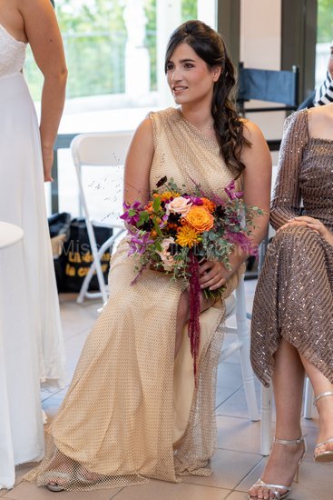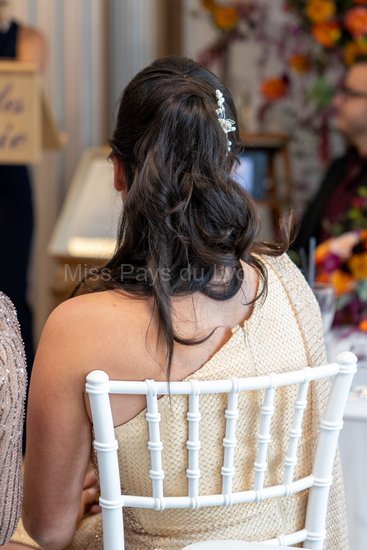 Pour la cérémonie laïque, Clémentine portait une robe de l’Atelier Mahie tandis que les Miss demoiselles d’honneur avaient revêtu des robes d’Alyna Couture.